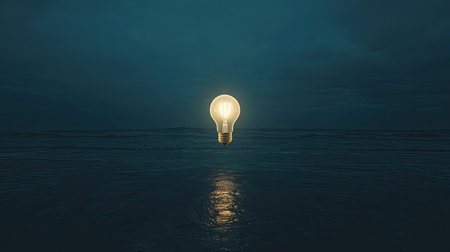 A mesmerizing image of a glowing light bulb hovering over dark ocean water with a moody night sky. This surreal scene evokes feelings of peace and inspiration.