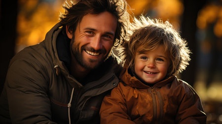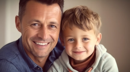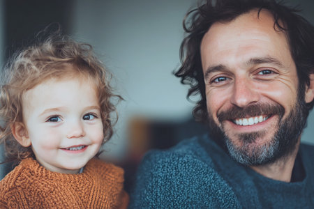 Smiling father and young child sit close in a cozy space, enjoying a heartwarming moment. Their carefree expressions reflect the joy of family connection and love.