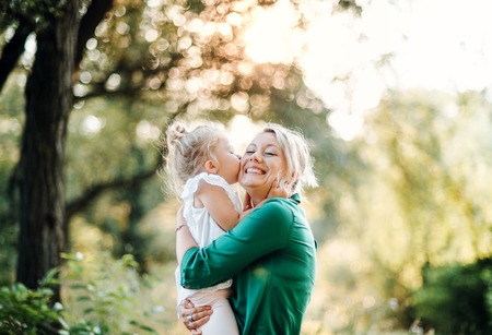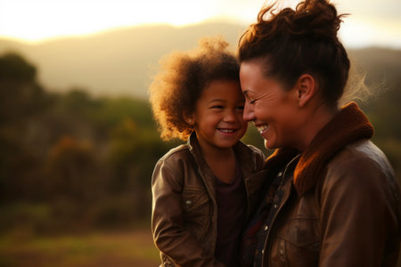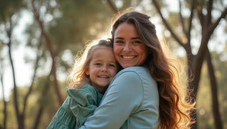 A radiant mother holds her smiling daughter close, surrounded by the warm glow of sunlight filtering through trees. This heartwarming scene captures the essence of love and connection, showcasing the bond between a woman and a young girl in a serene outdoor setting.