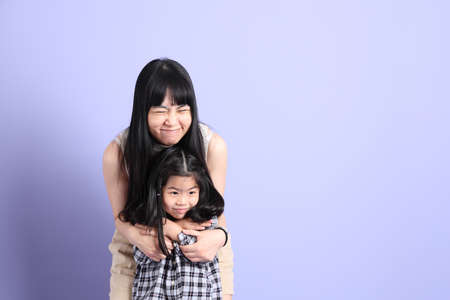 A young girl leans on her mother's shoulder, comforting her as she shows visible distress. The setting is intimate with soft lighting and a gray backdrop.