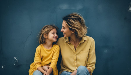 Generative AI : happy family mother and child daughter near an empty brick wall