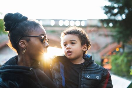 Portrait of an African american mother with his son standing outdoors in the park, having fun. Monoparental family.