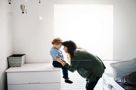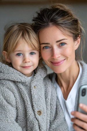 Mother and child with blue eyes smiling, sharing a tender family moment at home