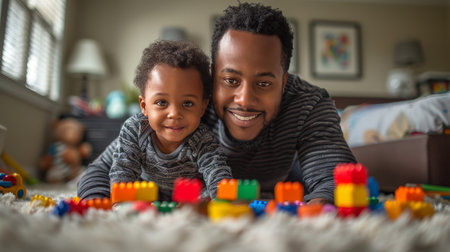 A man and a child laying on the floor engaged in play with colorful lego blocks.