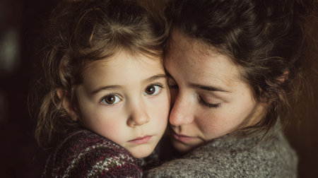A little girl comforts her mother by resting her head on her shoulder. The moment captures warmth and love amidst the mother's emotional struggle.