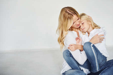 a mother with blond hair and her daughter are smiling and hugging. posing for the camera