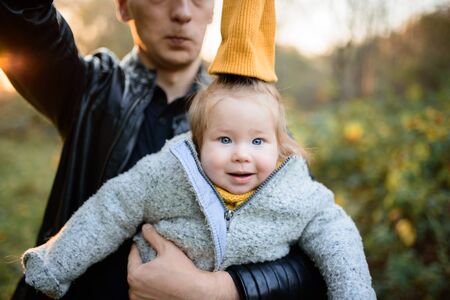 Happy smiling Caucasian father dad with cute adorable baby girl. Family in autumn fall park outdoor with yellow orange leaves trees.