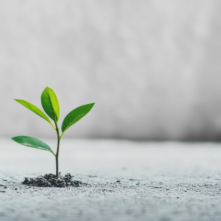 A small leaf emerges from a surface, symbolizing growth and hope against a warm, simple background with soft colors.