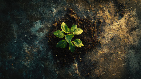 A young plant emerges from dry soil showcasing its fresh green leaves symbolizing resilience and growth in a minimalist setting.