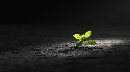 A vibrant green plant emerges from dark soil, illuminated by soft light. The scene captures the beauty of growth, resilience, and nature's serenity.