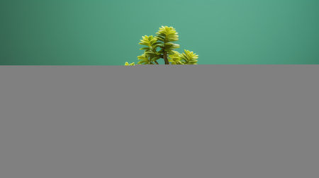 Artificial green office flower with leaves in a pot on yellow background, copy space