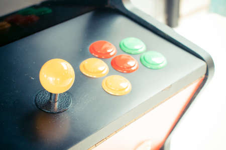 Yellow joystick of an old arcade video game with six colorful button. Copyspace. Retro filter.