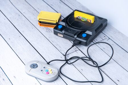 BANGKOK, THAILAND - MARCH 31, 2017 : Old Nintendo Entertainment System Family Computer and Hori Controller on wooden background. Illustrative editorial
