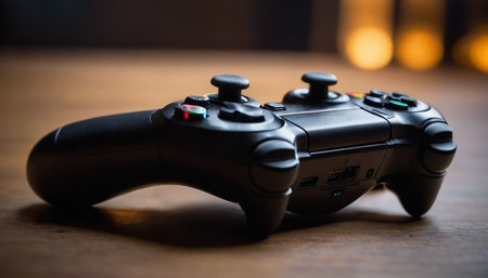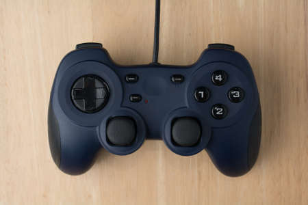video game controller on wooden table in the dark. Selective focus