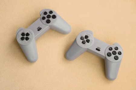 Playing games concept. Two pad joysticks lies on the blanket of furry orange fleece fabric. Controllers for video games on a background texture of light orange soft plush fleece material