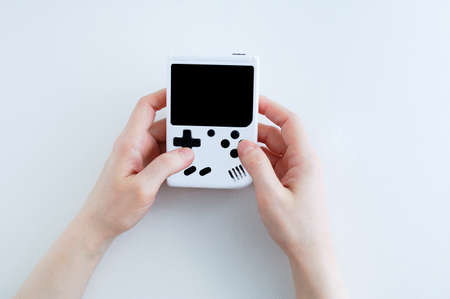 White game console with black display in the hands of a Caucasian woman. White background.