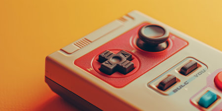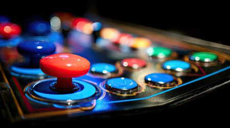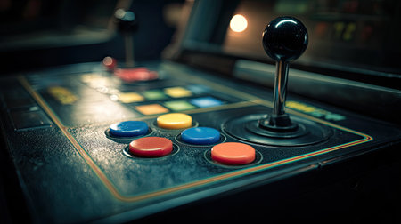 Close view of a vintage arcade game control panel showcasing a joystick and colorful buttons, capturing the nostalgia and excitement of retro gaming experiences.