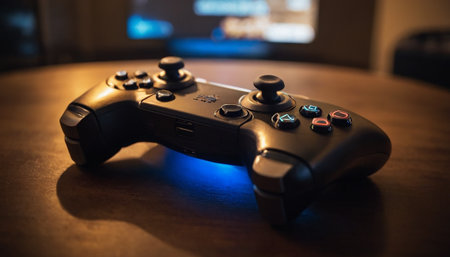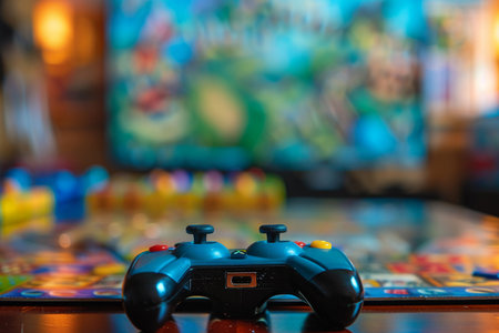 Close-up of a gaming controller on a table with a blurred background of a colorful video game screen