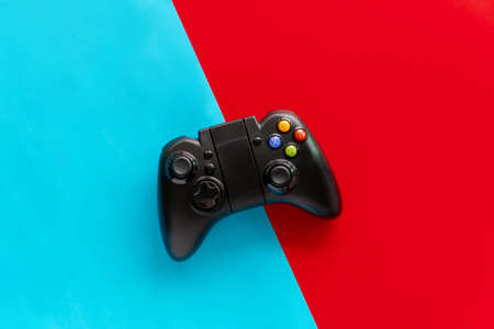 Black game Joystick isolated on a red and blue background