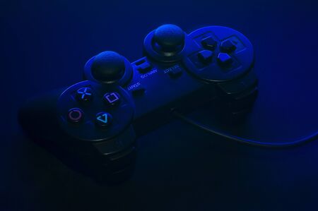 Black gamepad with blue backlight and beautiful shadows.