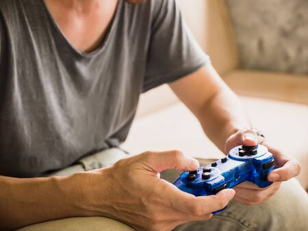 Man with game pad playing videogame. Hands close-up. Blue tint.