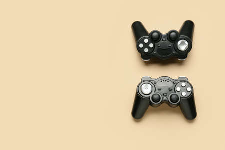 Modern joysticks on beige background