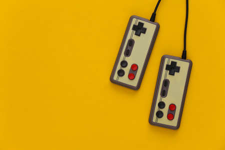 Two retro gamepads on yellow background. Gaming, video games.