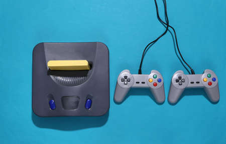 Retro video game console with joysticks on blue background. top view