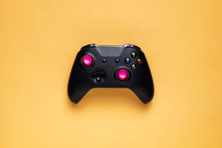 White joystick gamepad, game console on yellow colourful trendy modern fashion pin-up background. Computer gaming competition videogame control confrontation concept. Cyberspace symbol