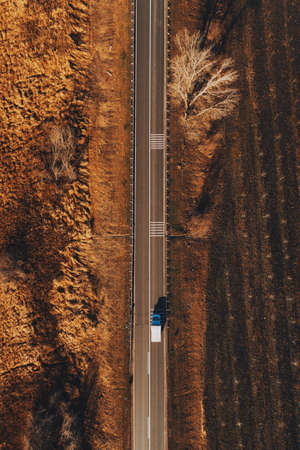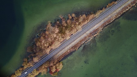 Aerial view of road and a car in autumn forest with red, yellow and orange leaves. Top view, from above