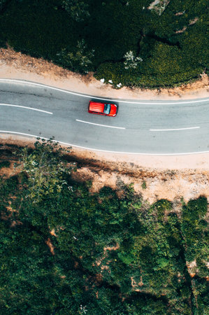 Aerial view car drive in green tree forest road winding road through the forest, Car drive on asphalt road between green tree forest, Electric vehicle EV car drive on asphalt road green tree forest.