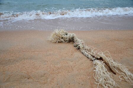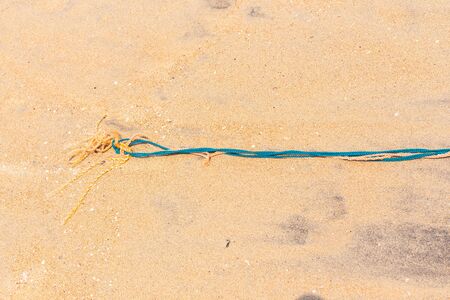 A background for design of a boat rope on a sandy beach. Photo of the ocean coastline with garbage.