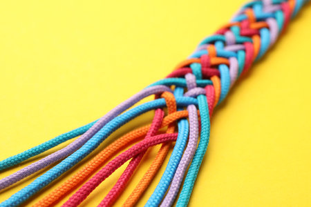 Braided colorful ropes on yellow background, closeup. Unity concept
