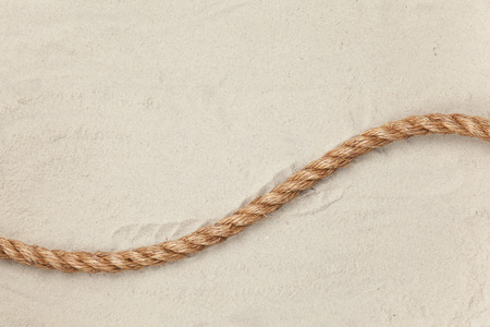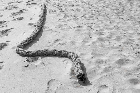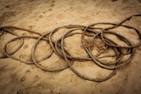 Close-up of old frayed boat rope as a background, rope on the background of sand
