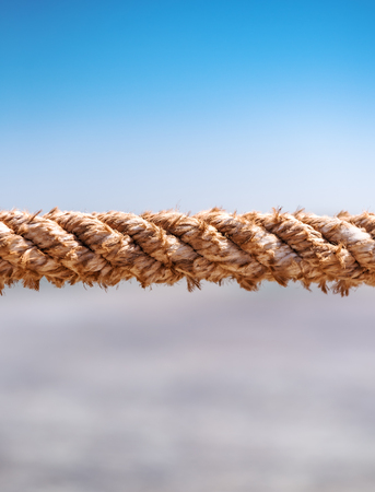 Selective focus on rope texture on blurred sea surface background. Stretched sea cable. Old nautical cord. Sea background with copy space.