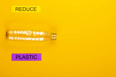 used plastic, crumpled empty bottles, packets, dish, container pollution garbage recycle eco concept yellow background close up