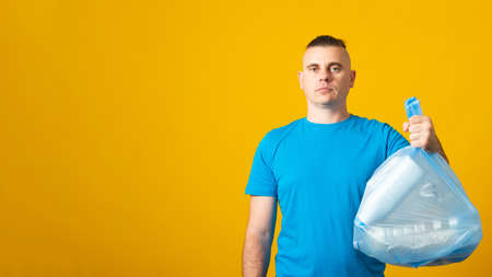 Banner copy space. Sad young man holding plastic trash bag on yellow background. Waste sorting and sustainability concept.