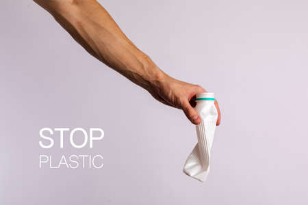 recycle, garbage, belongings, plastic water bottles, reduce the use of plastic ,with both hands, holding and moving the bottle, on the background, yellow.