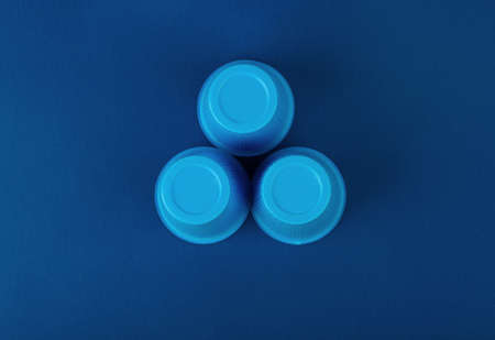 Crumpled plastic bottles on a blue background. Plastic trash. Copy space for text.