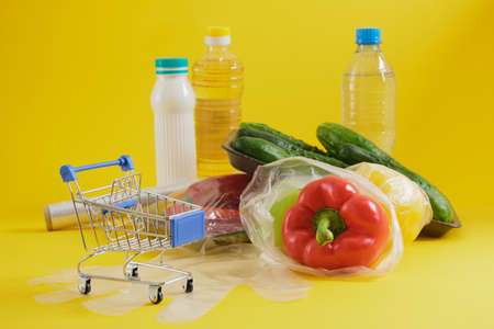 different types of plastic packaging on a blue background, a package with tomatoes, bananas wrapped in a film and a bottle of milk, environmental pollution concept, copy space