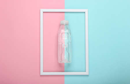 Plastic bottle of water on pink blue pastel background with white frame. Studio shot. Creative flat lay. Top view. Minimalism