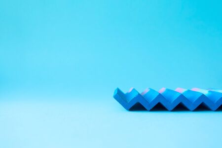 Blue with pink abstract concrete ribbed decor with selective focus on blue background with copy space. Scene with geometrical form figure still life composition. Backdrop for showcase or product presentation