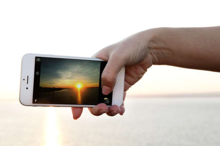 Close up of hands of woman taking photo with mobile phone of sunset while sitting in the beach.