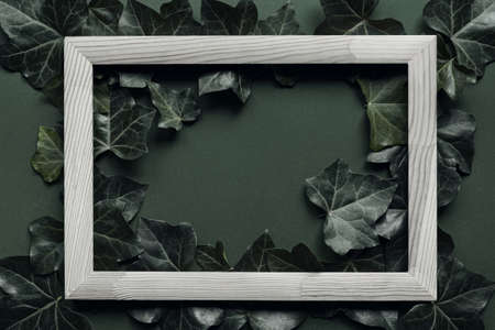 Green ivy leaves and wooden frame. nature concept background. minimal style. top view. flat lay.