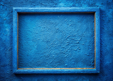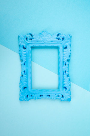 Empty blue painted baroque frame on blue shades color background, pop art abstract backdrop