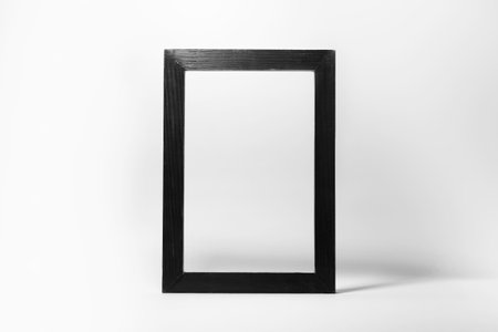 Frame mockup, black photo frame with blank surface on gray wall. Space for text.