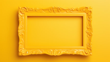 a yellow decorative photo frame, with rococo-inspired details, stands out against a yellow background. this mock design, in the style of rachel maclean, is rendered in cinema4d with 8k resolution. created by carl kleiner, the frame showcases texture-rich surfaces and subtle tonal values. ai generated
