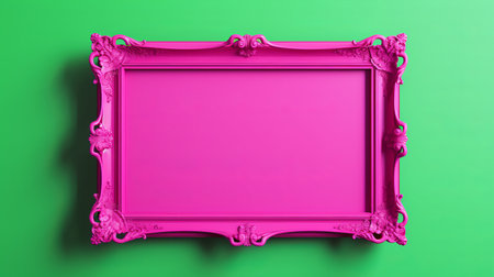 an ornate pink picture frame with playful colors, inspired by baroque compositions, is showcased over a vibrant green background. this 8k 3d artwork, created in the style of zbrush, exudes a sense of creativity and uniqueness. the advertisement-inspired design and magenta accents add a touch of modernity to this visually captivating video installation. ai generated