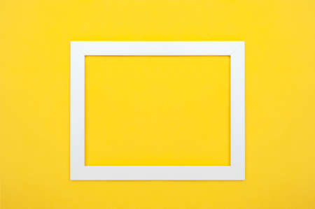 Minimalism style. White empty picture frame against abstract colored paper background, flat lay.