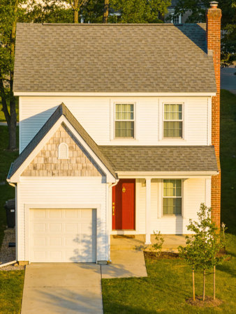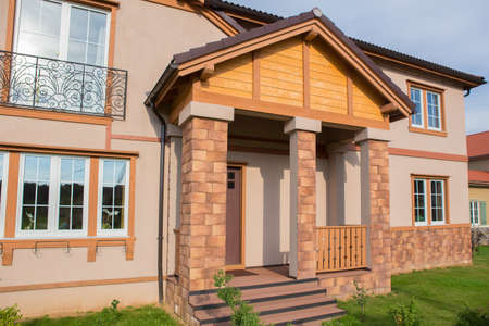 Architecture concept. Home in suburb. Residential house. Suburban home in neighborhood. Private residential architecture dwelling. Suburban house architecture. Cozy suburban house. Private residence